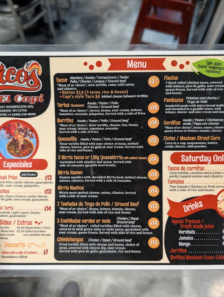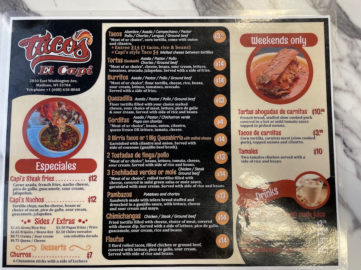 Tacos el Capi, located at 2810 E Washington Ave in Madison, WI, is a culinary gem offering an authentic taste of Mexican cuisine. Here, every dish tells a story, lovingly prepared with traditional ingredients and methods. Weekend specials include the mouthwatering Tacos De Carnitas, featuring slow-cooked pork embraced by fresh corn tortillas, and delectable Tamales served with rice and beans.